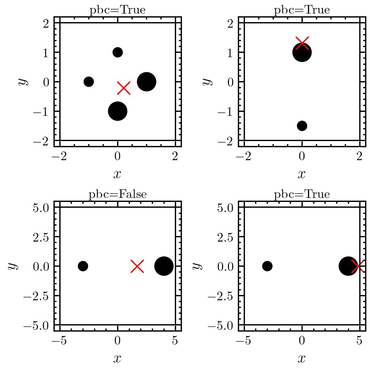 >>> fig, axs = amep.plot.new(figsize=(4,4), nrows=2, ncols=2) >>> axs = axs.flatten() >>> for i in range(4): ... axs[i].scatter(coords[i][:,0], coords[i][:,1], s=50*mass[i]**2, c='k') ... axs[i].scatter(com[i][0], com[i][1], s=100, marker='x', color='red') ... amep.plot.box(axs[i], box_boundary[i]) ... axs[i].set_title(titles[i]) ... axs[i].set_xlabel(r"$x$") ... axs[i].set_ylabel(r"$y$") >>> fig.savefig('./figures/cluster/cluster-center_of_mass_1.png')