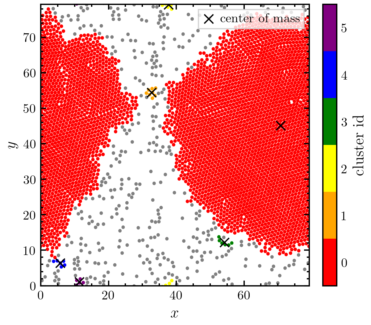 >>> traj = amep.load.traj("../examples/data/lammps.h5amep") >>> frame = traj[-1] >>> clusters, idx = amep.cluster.identify( ... frame.coords(), frame.box, pbc=True ... ) >>> com = amep.cluster.center_of_mass( ... frame.coords(), frame.box, frame.mass(), ... pbc=True, clusters=clusters ... ) >>> imax = 5 >>> fig, axs = amep.plot.new(figsize=(4,3.5)) >>> colors = ["red", "orange", "yellow", "green", "blue", "purple"] >>> mp = amep.plot.particles( ... axs, frame.coords()[idx<=imax], frame.box, radius=0.5, ... values=idx[idx<=imax], cmap=colors, vmin=-0.5, vmax=5.5 ... ) >>> amep.plot.particles( ... axs, frame.coords()[idx>imax], frame.box, radius=0.5, color="gray" ... ) >>> axs.scatter( ... com[:imax+1,0], com[:imax+1,1], color="k", s=50, ... marker="x", label="center of mass" ... ) >>> cax = amep.plot.add_colorbar( ... fig, axs, mp, label="cluster id" ... ) >>> amep.plot.format_axis(cax, ticks=False) >>> axs.legend(frameon=True) >>> axs.set_xlabel(r"$x$") >>> axs.set_ylabel(r"$y$") >>> fig.savefig('./figures/cluster/cluster-center_of_mass_2.png')