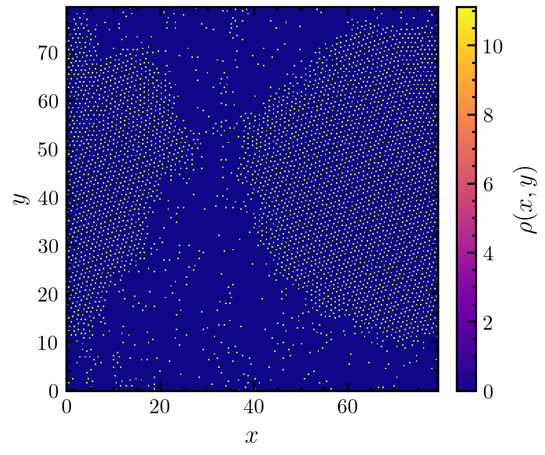 >>> import amep >>> traj = amep.load.traj("../examples/data/lammps.h5amep") >>> frame = traj[-1] >>> d, X, Y = amep.continuum.coords_to_density( ... frame.coords(), frame.box, dmin=0.3 ... ) >>> print('Integrated density: ', int(np.sum(d)*(X[0,1]-X[0,0])*(Y[1,0]-Y[0,0]))) Integrated density: 4000 >>> print('Particle number: ', frame.n()) Particle number: 4000 >>> fig, axs = amep.plot.new(figsize=(3.6,3)) >>> mp = amep.plot.field(axs, d, X, Y) >>> cax = amep.plot.add_colorbar( ... fig, axs, mp, label=r"$\rho(x,y)$" ... ) >>> axs.set_xlabel(r"$x$") >>> axs.set_ylabel(r"$y$") >>> fig.savefig("./figures/continuum/continuum-coords_to_density_1.png")