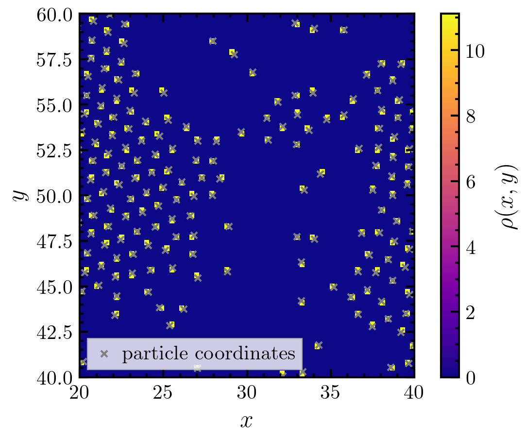 >>> fig, axs = amep.plot.new(figsize=(3.6,3)) >>> mp = amep.plot.field(axs, d, X, Y) >>> cax = amep.plot.add_colorbar( ... fig, axs, mp, label=r"$\rho(x,y)$" ... ) >>> axs.scatter( ... frame.coords()[:,0], frame.coords()[:,1], s=10, ... marker="x", color="gray", label="particle coordinates" ... ) >>> axs.set_xlabel(r"$x$") >>> axs.set_ylabel(r"$y$") >>> axs.set_xlim(20, 40) >>> axs.set_ylim(40, 60) >>> axs.legend(frameon=True) >>> fig.savefig('./figures/continuum/continuum-coords_to_density_2.png')