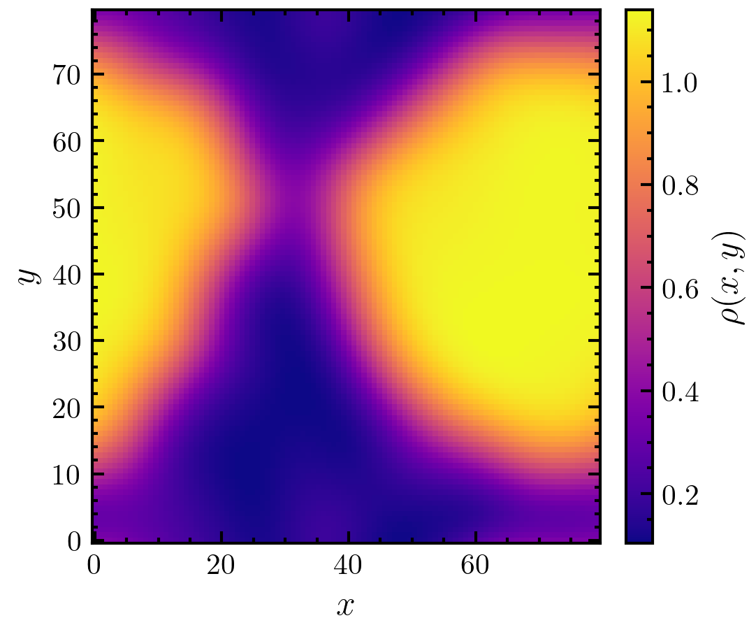 >>> import amep >>> traj = amep.load.traj("../examples/data/lammps.h5amep") >>> frame = traj[-1] >>> d, X, Y = amep.continuum.gkde( ... frame.coords(), frame.box, bandwidth=5.0 ... ) >>> fig, axs = amep.plot.new(figsize=(3.6,3)) >>> mp = amep.plot.field( ... axs, d, X, Y ... ) >>> cax = amep.plot.add_colorbar( ... fig, axs, mp, label=r"$\rho(x,y)$" ... ) >>> axs.set_xlabel(r"$x$") >>> axs.set_ylabel(r"$y$") >>> fig.savefig('./figures/continuum/continuum-gkde.png')