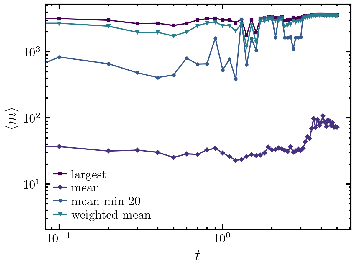 >>> import amep >>> traj = amep.load.traj("../examples/data/lammps.h5amep") >>> fig, axs = amep.plot.new() >>> clg = amep.evaluate.ClusterGrowth(traj, mode="largest") >>> axs.plot(clg.times, clg.frames, label="largest") >>> clg = amep.evaluate.ClusterGrowth(traj, mode="mean") >>> axs.plot(clg.times, clg.frames, label="mean") >>> clg = amep.evaluate.ClusterGrowth(traj, mode="mean", min_size=20) >>> axs.plot(clg.times, clg.frames, label="mean min 20") >>> clg = amep.evaluate.ClusterGrowth(traj, mode="weighted mean") >>> axs.plot(clg.times, clg.frames, label="weighted mean") >>> axs.loglog() >>> axs.legend() >>> axs.set_xlabel(r"$t$") >>> axs.set_ylabel(r"$\langle m\rangle$") >>> fig.savefig("./figures/evaluate/evaluate-ClusterGrowth_1.png")