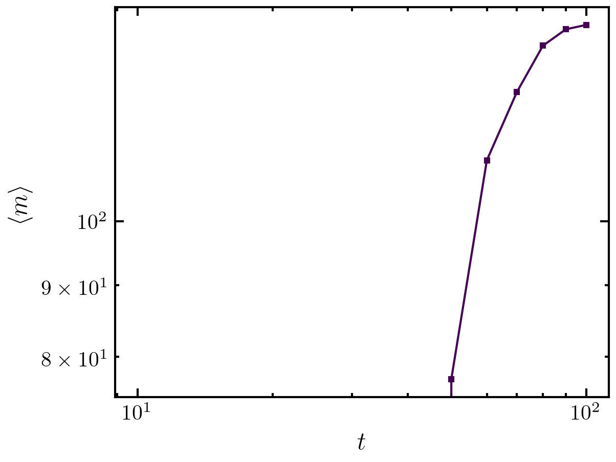 >>> traj = amep.load.traj("../examples/data/continuum.h5amep") >>> clg = amep.evaluate.ClusterGrowth( ... traj, ftype="p", threshold=0.2 ... ) >>> fig, axs = amep.plot.new() >>> axs.plot(clg.times, clg.frames) >>> axs.loglog() >>> axs.set_xlabel(r"$t$") >>> axs.set_ylabel(r"$\langle m\rangle$") >>> fig.savefig("./figures/evaluate/evaluate-ClusterGrowth_2.png")