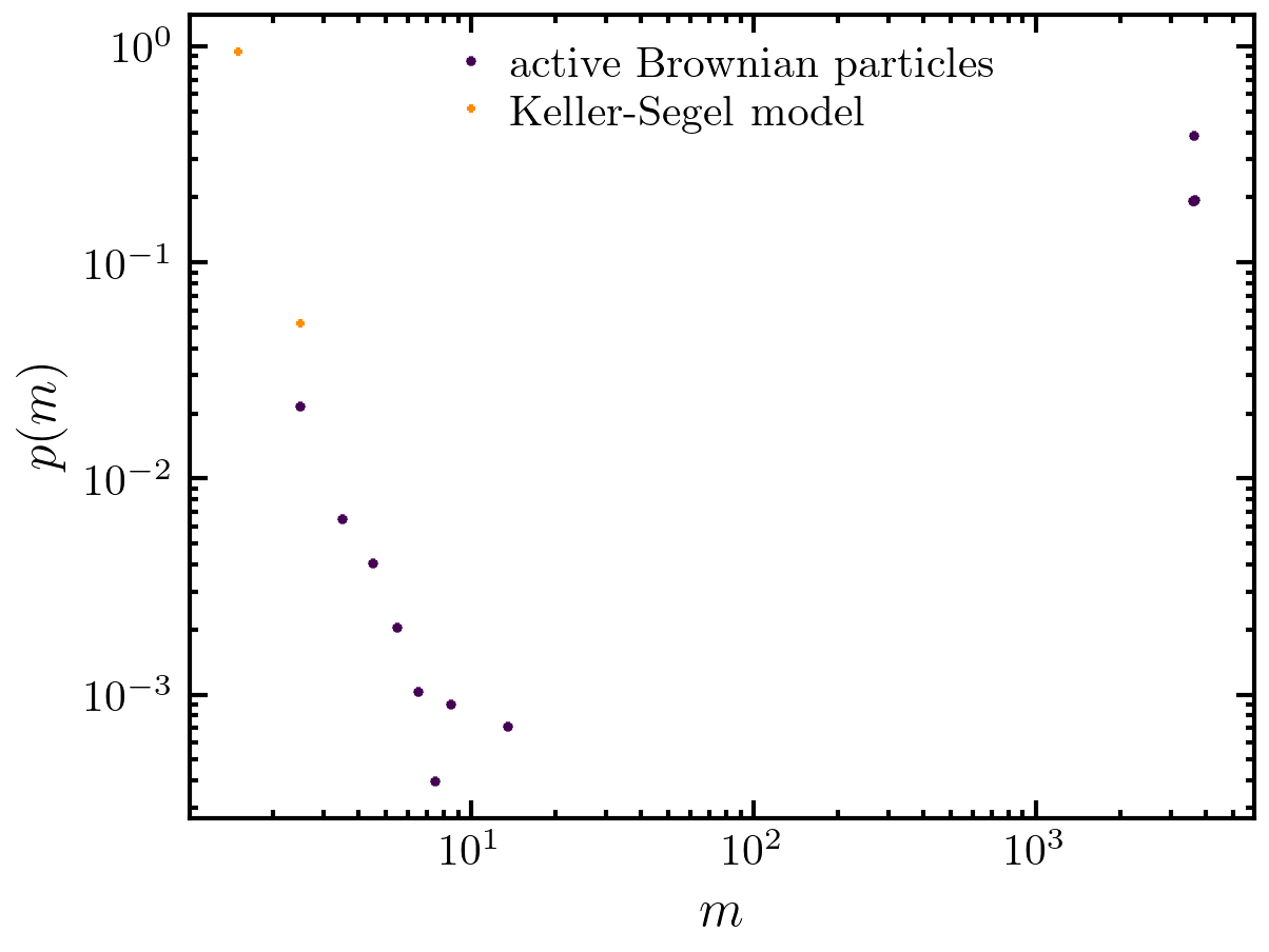 >>> import amep >>> ptraj = amep.load.traj("../examples/data/lammps.h5amep") >>> ftraj = amep.load.traj("../examples/data/continuum.h5amep") >>> pcsd = amep.evaluate.ClusterSizeDist( ... ptraj, nav=5, pbc=True, skip=0.8 ... ) >>> fcsd = amep.evaluate.ClusterSizeDist( ... ftraj, nav=5, pbc=True, skip=0.5, ftype="p", ... use_density=False, threshold=0.2 ... ) >>> pcsd.save("./eval/csd-eval.h5", database=True, name="particles") >>> fcsd.save("./eval/csd-eval.h5", database=True, name="field") >>> fig, axs = amep.plot.new() >>> axs.plot( ... pcsd.sizes, pcsd.avg, marker="*", ls="", ... label="active Brownian particles" ... ) >>> axs.plot( ... fcsd.sizes, fcsd.avg, marker="+", ls="", ... label="Keller-Segel model", color="darkorange" ... ) >>> axs.loglog() >>> axs.set_xlabel(r"$m$") >>> axs.set_ylabel(r"$p(m)$") >>> axs.legend() >>> fig.savefig("./figures/evaluate/evaluate-ClusterSizeDist.png")