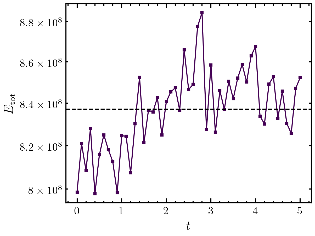 >>> import amep >>> traj = amep.load.traj("../examples/data/lammps.h5amep") >>> ekintotal = amep.evaluate.EkinTot( ... traj, mass=1.0, inertia=0.1, nav=traj.nframes ... ) >>> fig, axs = amep.plot.new() >>> axs.plot(ekintotal.times, ekintotal.frames) >>> axs.axhline(ekintotal.avg, ls="--", c="k") >>> axs.set_xlabel(r'$t$') >>> axs.set_ylabel(r'$E_{\rm tot}$') >>> axs.semilogy() >>> fig.savefig("./figures/evaluate/evaluate-EkinTot.png")