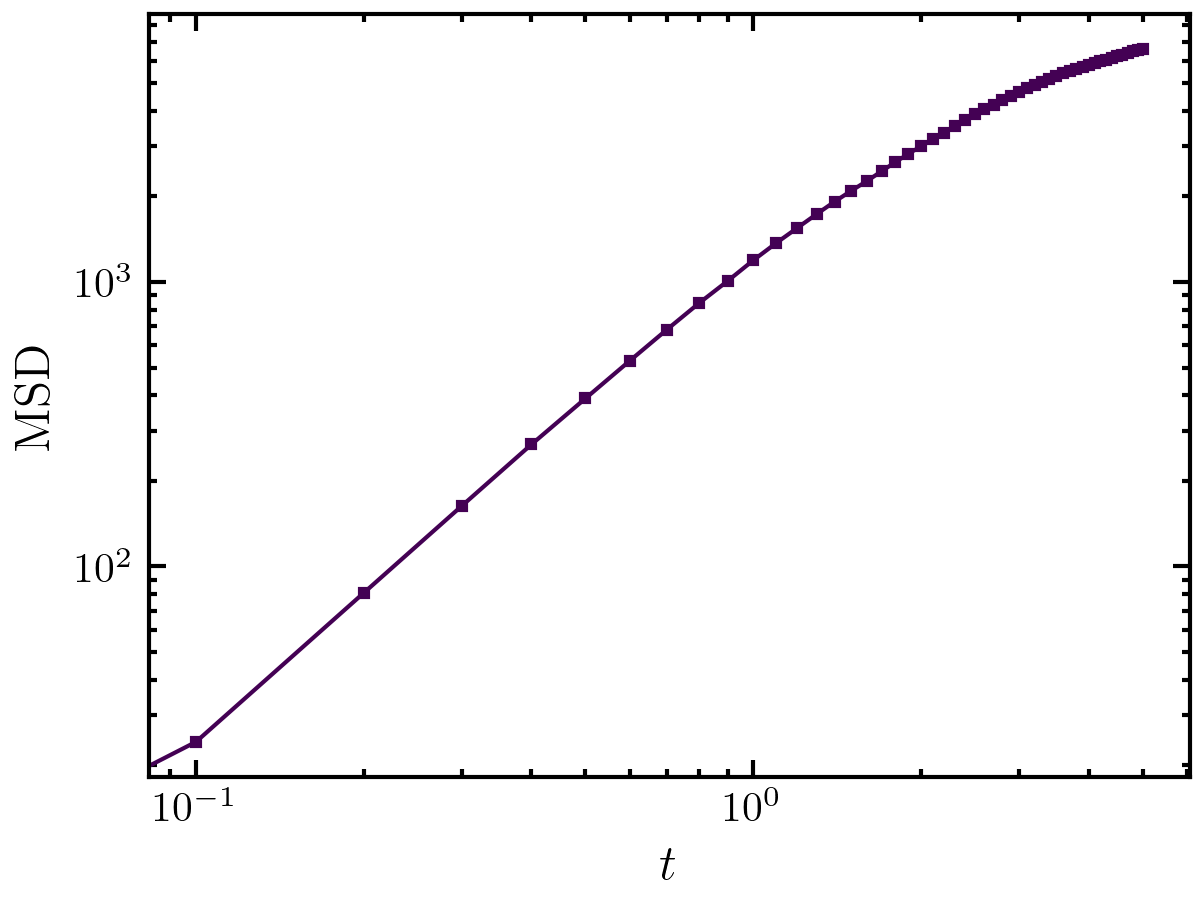 >>> import amep >>> traj = amep.load.traj("../examples/data/lammps.h5amep") >>> def msd(frame, start=None): ... vec = start.unwrapped_coords() - frame.unwrapped_coords() ... return (vec ** 2).sum(axis=1).mean() >>> msd_eval = amep.evaluate.Function( ... traj, msd, nav=traj.nframes, start=traj[0] ... ) >>> msd_eval.name = "msd" >>> msd_eval.save("./eval/msd_eval.h5") >>> fig, axs = amep.plot.new() >>> axs.plot(traj.times, msd_eval.frames) >>> axs.set_xlabel(r"$t$") >>> axs.set_ylabel(r"MSD") >>> axs.loglog() >>> fig.savefig("./figures/evaluate/evaluate-Function.png")