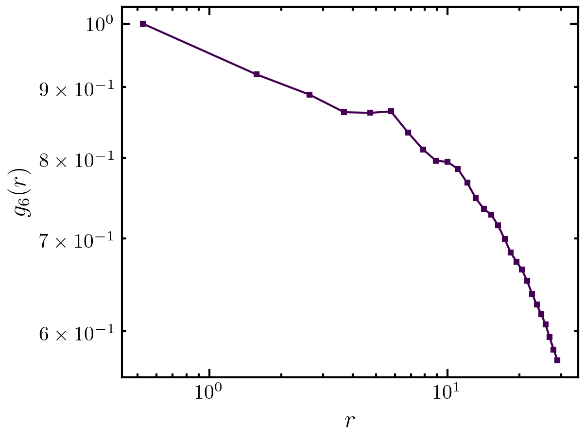 \[g_6(r=|\vec{r}_j-\vec{r}_i|)=\langle\Psi_6(\vec{r}_j)\Psi_6(\vec{r}_i)\rangle / \langle\Psi_6^2(\vec{r}_j)\rangle.\]See Refs. [1] [2] [3] for further information.