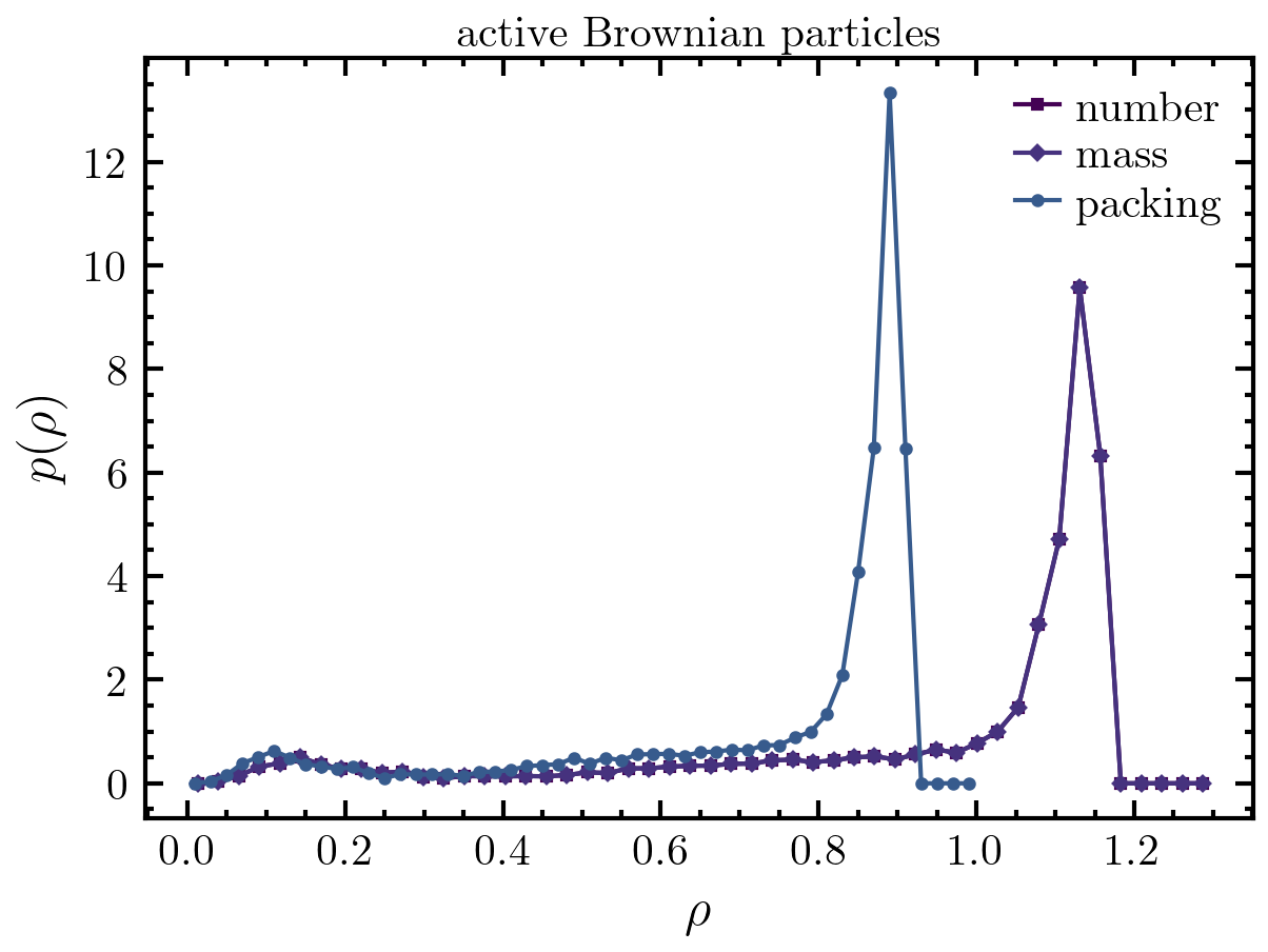 >>> import amep >>> traj = amep.load.traj("../examples/data/lammps.h5amep") >>> ld1 = amep.evaluate.LDdist( ... traj, nav=2, mode="number", skip=0.9, xmin=0.0, xmax=1.3 ... ) >>> ld2 = amep.evaluate.LDdist( ... traj, nav=2, mode="mass", skip=0.9, xmin=0.0, xmax=1.3 ... ) >>> ld3 = amep.evaluate.LDdist( ... traj, nav=2, mode="packing", skip=0.9, xmin=0.0, xmax=1.0 ... ) >>> ld1.save("./eval/ld_abp.h5", database=True, name="number") >>> ld2.save("./eval/ld_abp.h5", database=True, name="mass") >>> ld3.save("./eval/ld_abp.h5", database=True, name="packing") >>> fig, axs = amep.plot.new() >>> axs.plot(ld1.ld, ld1.avg, label="number") >>> axs.plot(ld2.ld, ld2.avg, label="mass") >>> axs.plot(ld3.ld, ld3.avg, label="packing") >>> axs.legend() >>> axs.set_xlabel(r"$\rho$") >>> axs.set_ylabel(r"$p(\rho)$") >>> axs.set_title("active Brownian particles") >>> fig.savefig("./figures/evaluate/evaluate-LDdist_1.png")