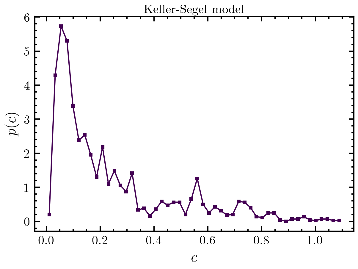 >>> traj = amep.load.traj("../examples/data/continuum.h5amep") >>> ld = amep.evaluate.LDdist( ... traj, nav=2, skip=0.9, xmin=0.0, xmax=1.1, ftype="c" ... ) >>> ld.save("./eval/ld.h5") >>> fig, axs = amep.plot.new() >>> axs.plot(ld.ld, ld.avg) >>> axs.set_xlabel(r'$c$') >>> axs.set_ylabel(r'$p(c)$') >>> axs.set_title("Keller-Segel model") >>> fig.savefig("./figures/evaluate/evaluate-LDdist_2.png")