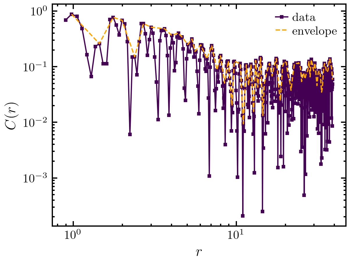 >>> import amep >>> traj = amep.load.traj("../examples/data/lammps.h5amep") >>> poscor = amep.evaluate.PosOrderCor( ... traj, skip=0.9, nav=2 ... ) >>> poscor.save("./eval/poscor.h5") >>> y,x = amep.utils.envelope(poscor.avg, x=poscor.r) >>> fig, axs = amep.plot.new() >>> axs.plot(poscor.r, poscor.avg, label="data") >>> axs.plot(x, y, marker="", ls="--", label="envelope", c="orange") >>> axs.loglog() >>> axs.set_xlabel(r"$r$") >>> axs.set_ylabel(r"$C(r)$") >>> axs.legend() >>> fig.savefig("./figures/evaluate/evaluate-PosOrderCor.png")