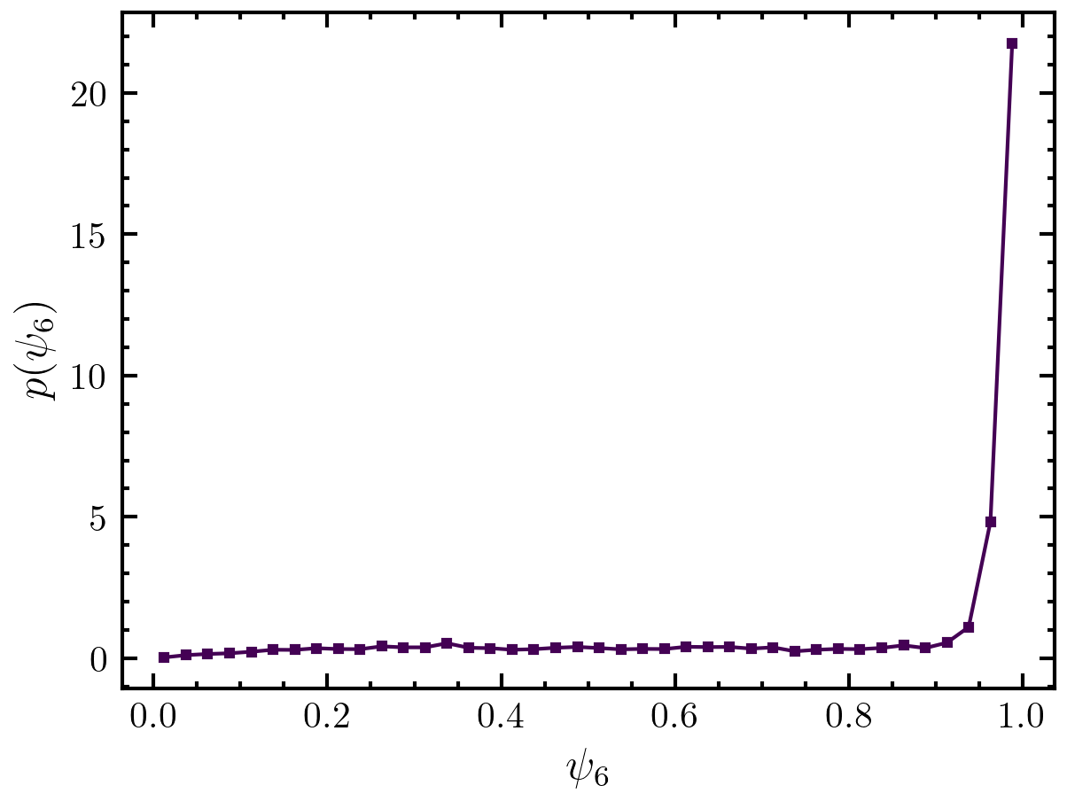 \[\Psi_6(\vec{r}_j) = \frac{1}{6} \sum_{n=1}^6\exp(i6\theta_{jn}),\]where the sum goes of the six nearest neighbors of the particle at position \(\vec{r}_j\). The value of \(\theta_{jn}\) is equal to the angle between the connection line from \(\vec{r}_j\) to \(\vec{r}_n\) and the x axis. See also Refs. [1] [2] [3] for further information.