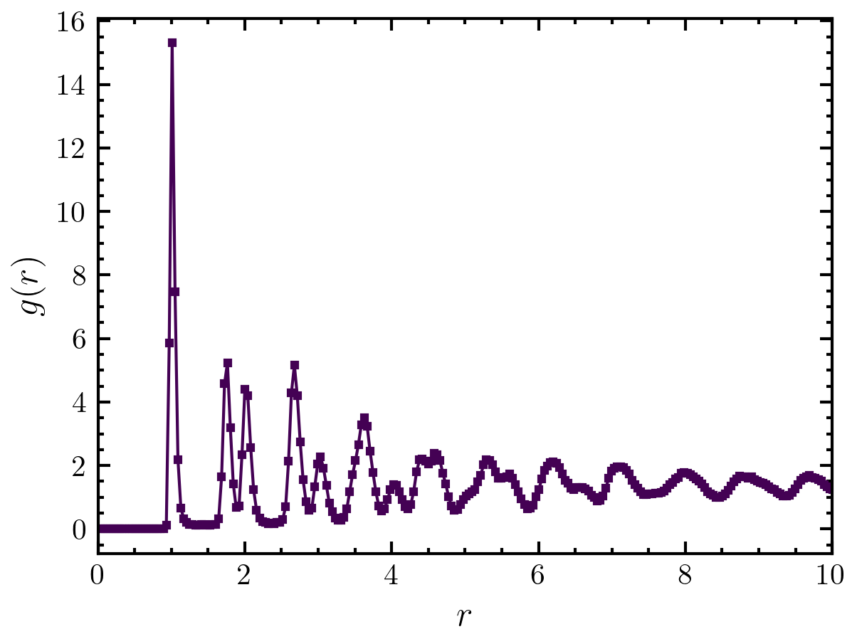 \[g(r) = \frac{1}{\rho N}\sum\limits_{k}\sum\limits_{l\neq k} \left\langle\frac{\delta\left(r-\left|\vec{r}_k(t) -\vec{r}_l(t)\right|\right)}{2\pi r}\right\rangle_t\]References