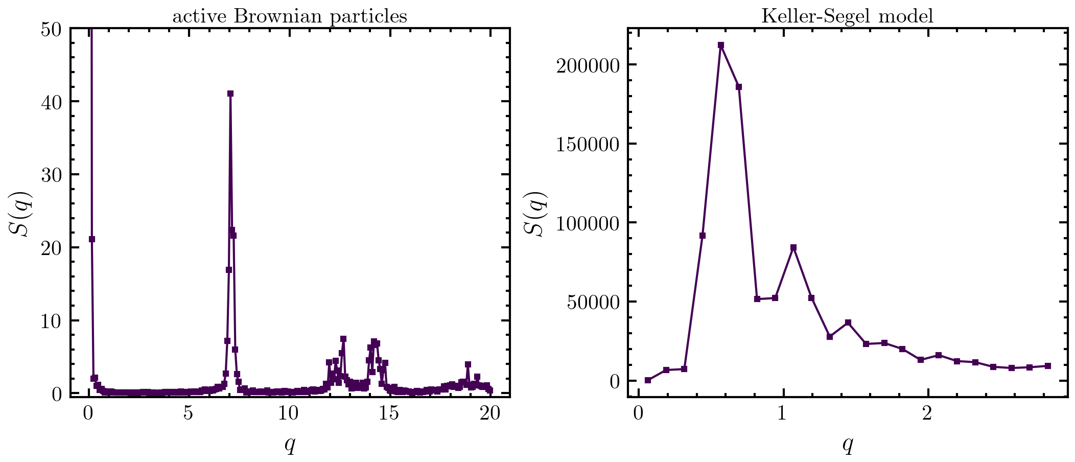 >>> import amep >>> ptraj = amep.load.traj("../examples/data/lammps.h5amep") >>> ftraj = amep.load.traj("../examples/data/continuum.h5amep") >>> psfiso = amep.evaluate.SFiso(ptraj, skip=0.9, nav=2, qmax=20) >>> fsfiso = amep.evaluate.SFiso(ftraj, skip=0.9, nav=2, ftype="c") >>> psfiso.save("./eval/sfiso_eval.h5", database=True, name="particles") >>> fsfiso.save("./eval/sfiso_eval.h5", database=True, name="field") >>> L = amep.utils.domain_length(psfiso.avg, psfiso.q, qmax=1.0) >>> print(L) 57.88815991321122 >>> fig, axs = amep.plot.new(figsize=(7,3), ncols=2) >>> axs[0].plot(psfiso.q, psfiso.avg) >>> axs[0].set_xlabel(r"$q$") >>> axs[0].set_ylabel(r"$S(q)$") >>> axs[0].set_title("active Brownian particles") >>> axs[0].set_ylim(-0.5,50) >>> axs[1].plot(fsfiso.q, fsfiso.avg) >>> axs[1].set_xlabel(r"$q$") >>> axs[1].set_ylabel(r"$S(q)$") >>> axs[1].set_title("Keller-Segel model") >>> fig.savefig("./figures/evaluate/evaluate-SFiso.png")