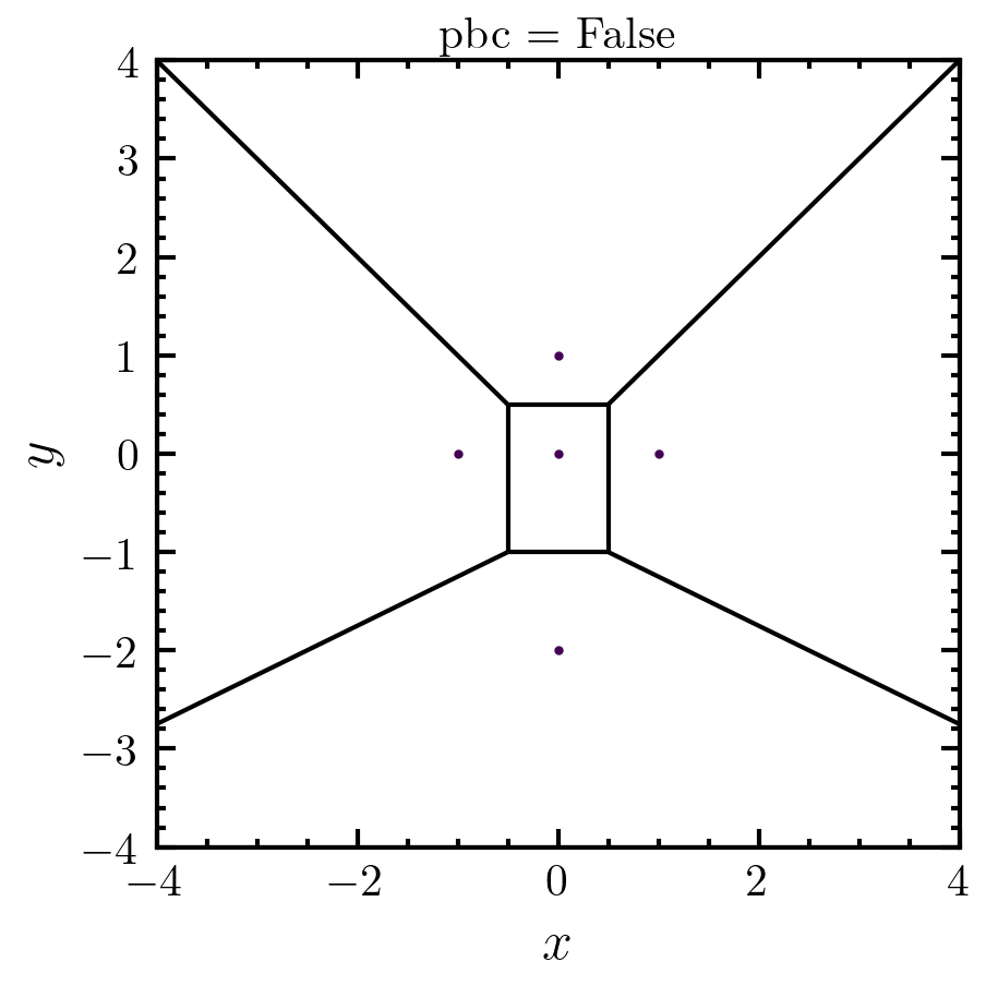 >>> import amep >>> import numpy as np >>> coords = np.array([[0,0,0],[1,0,0],[0,1,0],[-1,0,0],[0,-2,0]]) >>> box_boundary = np.array([[-4,4],[-4,4],[-0.5,0.5]]) >>> nnn, distances, neighbors, vor, ids = amep.order.next_neighbors( ... coords, box_boundary, pbc=False ... ) >>> print(nnn) # number of next neighbors [4 3 3 3 3] >>> print(distances) # next neighbor distances [list([1.0, 1.0, 1.0, 2.0]) list([1.4142135623730951, 1.0, 2.23606797749979]) list([1.4142135623730951, 1.4142135623730951, 1.0]) list([1.4142135623730951, 1.0, 2.23606797749979]) list([2.23606797749979, 2.23606797749979, 2.0])] >>> print(neighbors) # neighbor ids [list([3, 1, 2, 4]) list([2, 0, 4]) list([3, 1, 0]) list([2, 0, 4]) list([3, 1, 0])] >>> fig, axs = amep.plot.new(figsize=(3,3)) >>> amep.plot.voronoi(axs, vor, show_vertices=False) >>> axs.set_xlabel(r'$x$') >>> axs.set_ylabel(r'$y$') >>> axs.set_title('pbc = False') >>> axs.set_xlim(box_boundary[0]) >>> axs.set_ylim(box_boundary[1]) >>> fig.savefig('./figures/order/order-next_neighbors-pbc-False.png') >>>