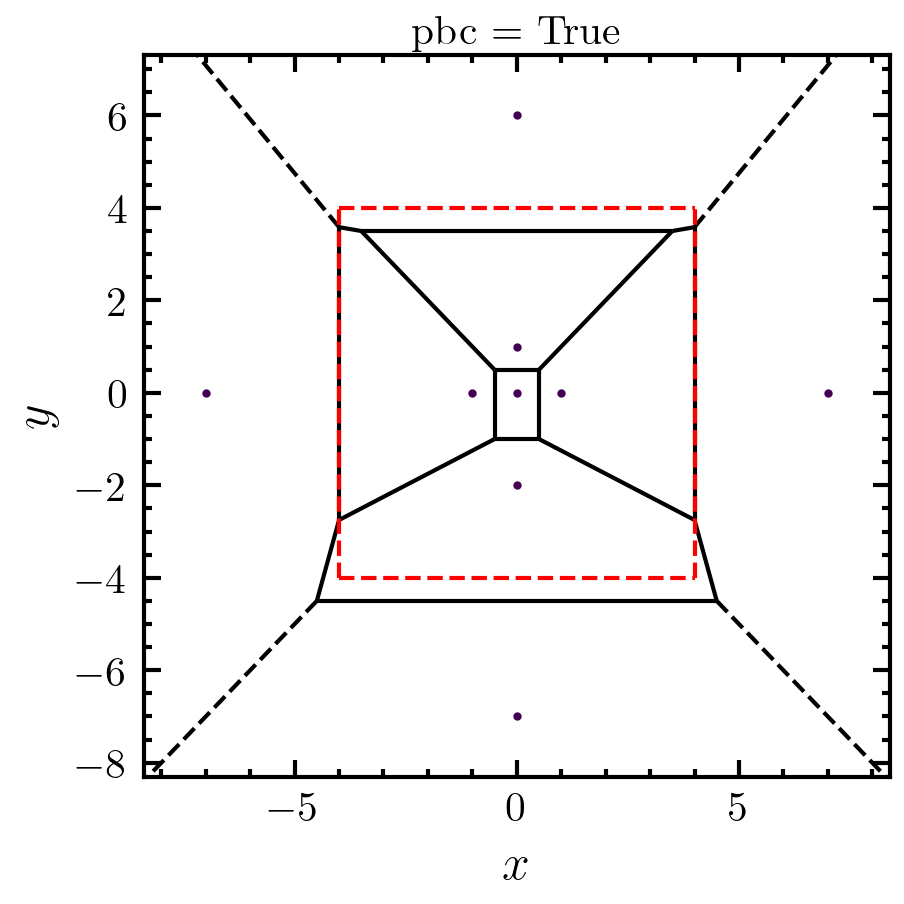>>> nnn, distances, neighbors, vor, ids = amep.order.next_neighbors( ... coords, box_boundary, pbc=True ... ) >>> print(nnn) # number of next neighbors [4 5 4 5 6] >>> print(distances) # next neighbor distances [list([1.0, 1.0, 2.0, 1.0]) list([2.23606797749979, 6.0, 1.0, 1.4142135623730951, 6.082762530298219]) list([1.4142135623730951, 1.4142135623730951, 1.0, 5.0]) list([2.23606797749979, 6.0, 1.0, 1.4142135623730951, 6.082762530298219]) list([5.0, 2.23606797749979, 7.280109889280518, 2.23606797749979, 7.280109889280518, 2.0])] >>> print(neighbors) # neighbor ids [list([3, 1, 4, 2]) list([4, 3, 0, 2, 2]) list([3, 1, 0, 2]) list([4, 0, 0, 2, 2]) list([1, 3, 0, 1, 3, 0])] >>> fig, axs = amep.plot.new(figsize=(3,3)) >>> amep.plot.voronoi(axs, vor, show_vertices=False) >>> amep.plot.box(axs, box_boundary=box_boundary, ls='--', c='r') >>> axs.set_xlabel(r'$x$') >>> axs.set_ylabel(r'$y$') >>> axs.set_title('pbc = True') >>> fig.savefig('./figures/order/order-next_neighbors-pbc-True.png')