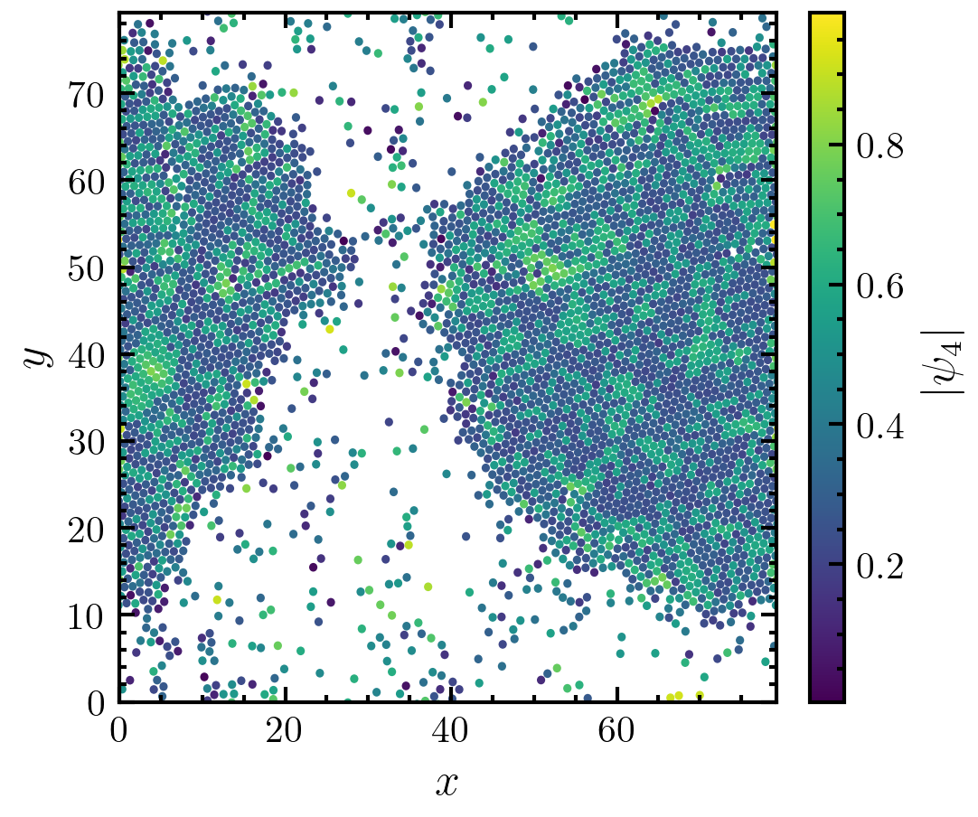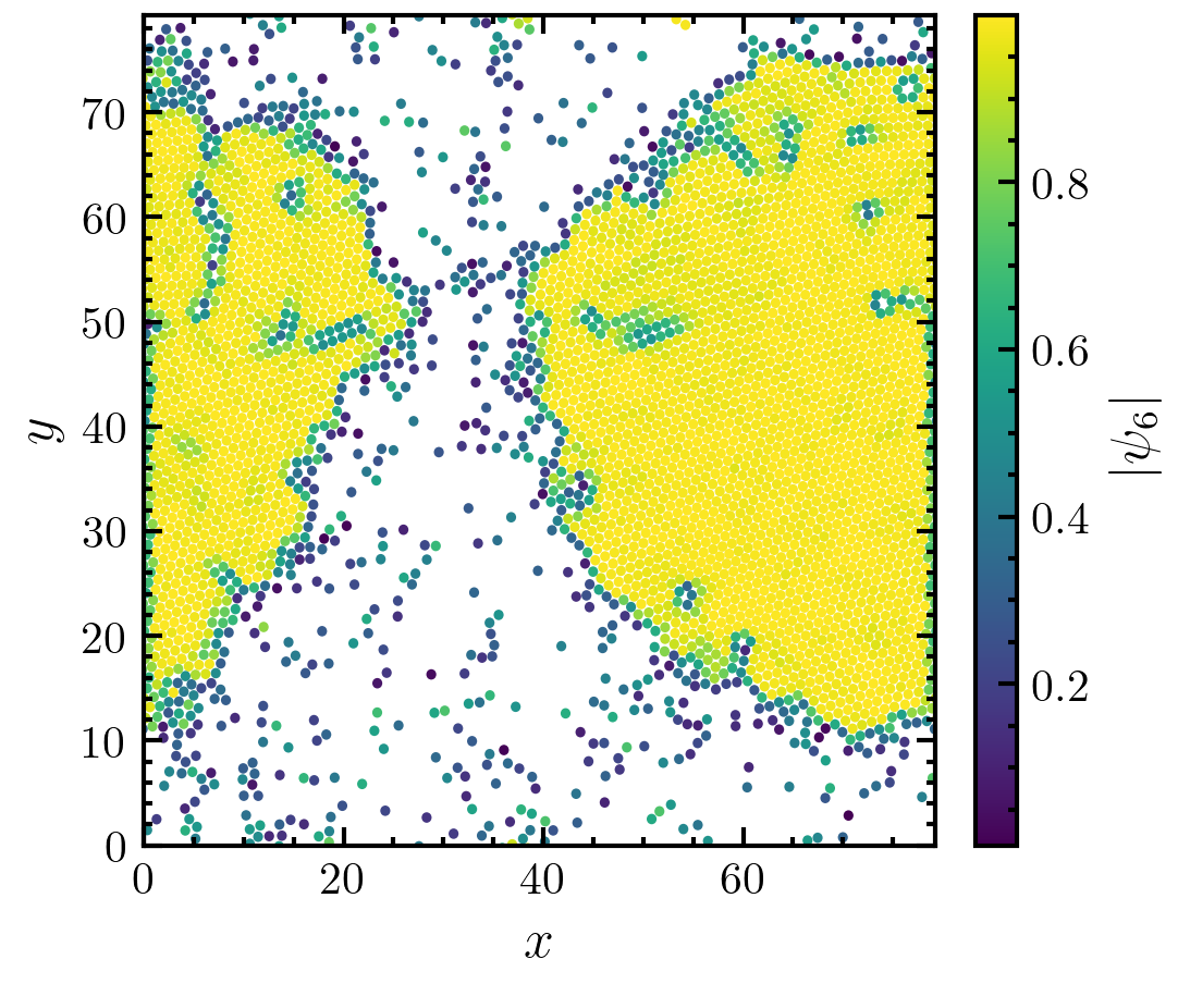 \[\Psi_k(\vec{r}_j) = \frac{1}{k} \sum_{n=1}^k\exp(ik\theta_{jn}),\]where the sum goes over the \(k\) nearest neighbors of the particle at position \(\vec{r}_j\). The value of \(\theta_{jn}\) is equal to the angle between the connection line from \(\vec{r}_j\) to \(\vec{r}_n\) and the x axis. See also Refs. [1] [2] [3] for further information.
