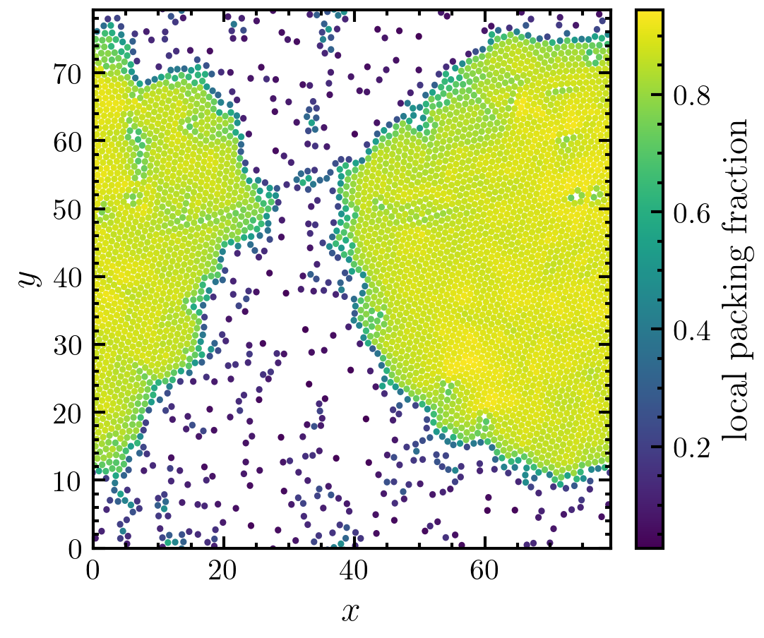 >>> import amep >>> traj = amep.load.traj("../examples/data/lammps.h5amep") >>> frame = traj[-1] >>> ld = amep.order.voronoi_density( ... frame.coords(), frame.box, radius=frame.radius(), ... pbc=True, mode="packing" ... ) >>> fig, axs = amep.plot.new(figsize=(3.6,3)) >>> mp = amep.plot.particles( ... axs, frame.coords(), frame.box, frame.radius(), ... values=ld ... ) >>> cax = amep.plot.add_colorbar( ... fig, axs, mp, label="local packing fraction" ... ) >>> axs.set_xlabel(r"$x$") >>> axs.set_ylabel(r"$y$") >>> fig.savefig("./figures/order/order-voronoi_density.png")