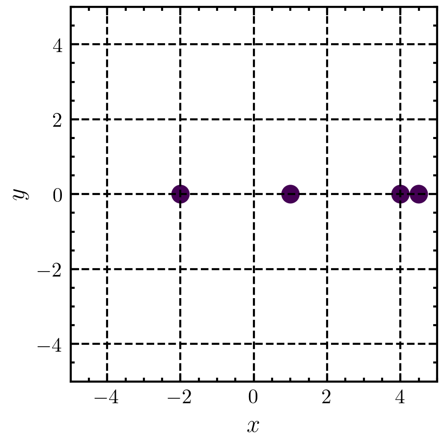 >>> import amep >>> import numpy as np >>> coords = np.array([[1,0,0], [4,0,0], [-2,0,0], [4.5,0,0]]) >>> box_boundary = np.array([[-5,5],[-5,5],[-0.5,0.5]]) >>> box = box_boundary[:,1] - box_boundary[:,0] >>> fig, axs = amep.plot.new(figsize=(3,3)) >>> axs.grid(visible=True) >>> amep.plot.particles(axs, coords, box_boundary, 0.25) >>> amep.plot.box(axs, box_boundary) >>> axs.set_xlabel(r'$x$') >>> axs.set_ylabel(r'$y$') >>> fig.savefig('./figures/pbc/pbc-distance_matrix_parallel.png') >>>