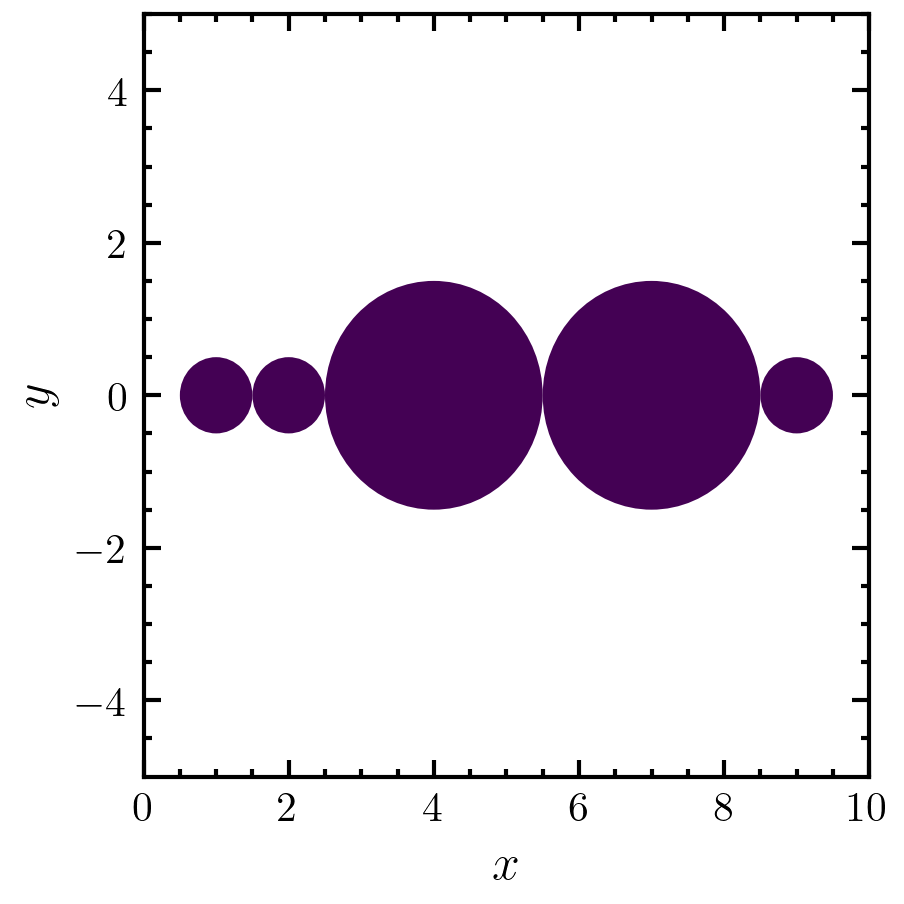 >>> import amep >>> import numpy as np >>> coords = np.array( ... [[2,0,0], [1,0,0], [4,0,0], [7,0,0], [9,0,0]], ... dtype=float ... ) >>> ids = np.array([0,1,2,3,4]) >>> sizes = np.array([1,1,3,3,1], dtype=float) >>> box_boundary = np.array([[0,10],[-5,5],[0,1.0]]) >>> pairs = amep.pbc.find_pairs( ... coords, box_boundary, rmax=2, sizes=sizes ... ) >>> print(pairs) [[0 1] [1 4] [0 2] [1 2] [1 3] [4 3] [2 3]] >>> fig, axs = amep.plot.new(figsize=(3,3)) >>> amep.plot.particles(axs, coords, box_boundary, sizes/2.) >>> axs.set_xlabel(r"$x$") >>> axs.set_ylabel(r"$y$") >>> fig.savefig("./figures/pbc/pbc-find_pairs.png") >>>
