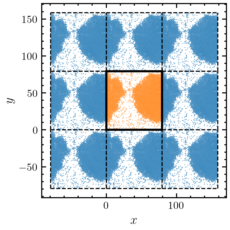 >>> import amep >>> traj = amep.load.traj("../examples/data/lammps.h5amep") >>> frame = traj[-1] >>> images = amep.pbc.pbc_points( ... frame.coords(), frame.box, inclusive=False ... ) >>> perm_vectors = np.array([ ... [-1, -1, 0], ... [-1, 0, 0], ... [-1, 1, 0], ... [ 0, -1, 0], ... [ 0, 1, 0], ... [ 1, -1, 0], ... [ 1, 0, 0], ... [ 1, 1, 0] ... ]).astype(float) >>> fig, axs = amep.plot.new(figsize=(3,3)) >>> amep.plot.particles( ... axs, images, frame.box, 0.5, color="tab:blue", ... set_ax_limits=False ... ) >>> amep.plot.particles( ... axs, frame.coords(), frame.box, 0.5, color="tab:orange", ... set_ax_limits=False ... ) >>> amep.plot.box(axs, frame.box, color='k', linewidth=2) >>> for p in perm_vectors: ... shift = p*(frame.box[:,1]-frame.box[:,0]) ... amep.plot.box( ... axs, frame.box+shift[:,None], color='k', ... linewidth=1, linestyle='--' ... ) >>> axs.set_xlabel(r'$x$') >>> axs.set_ylabel(r'$y$') >>> fig.savefig('./figures/pbc/pbc-pbc_points.png') >>>