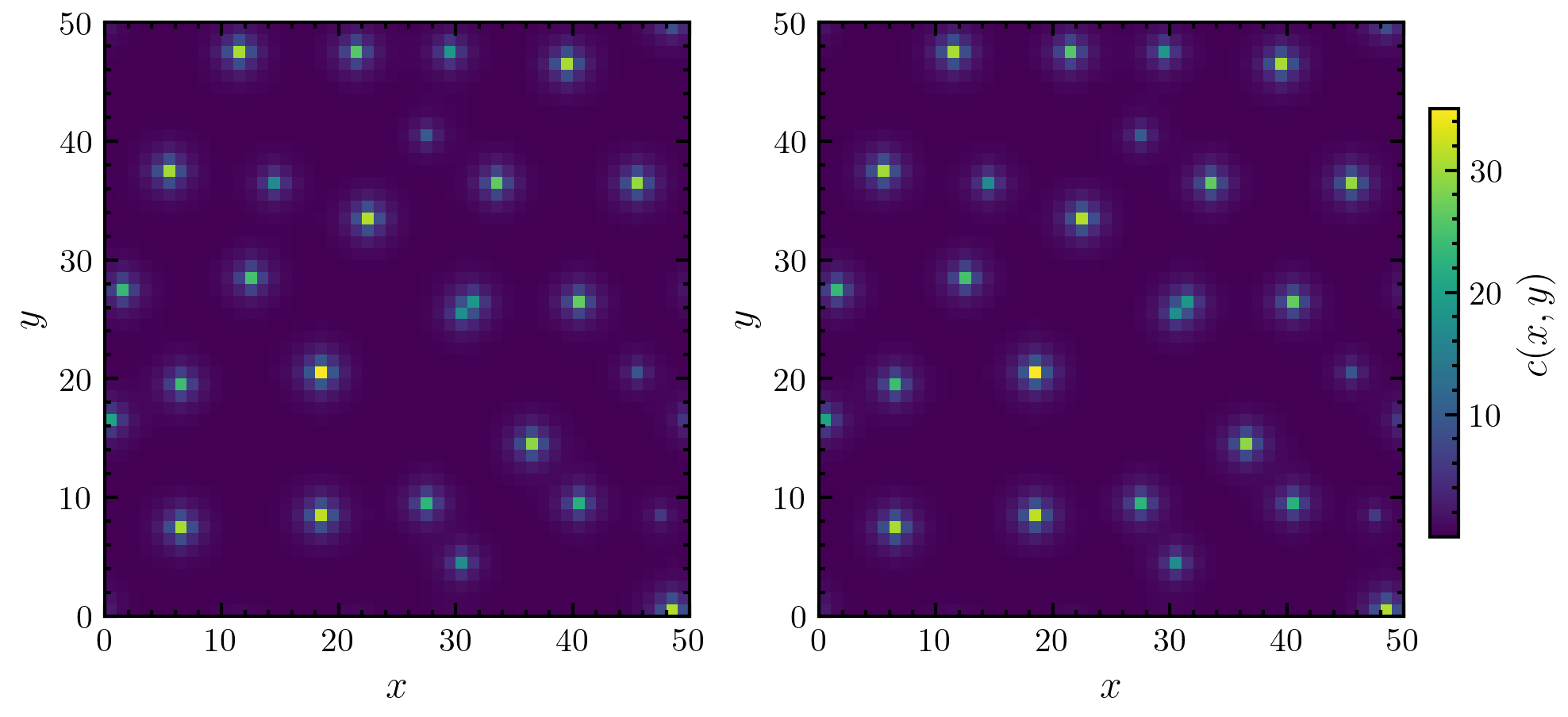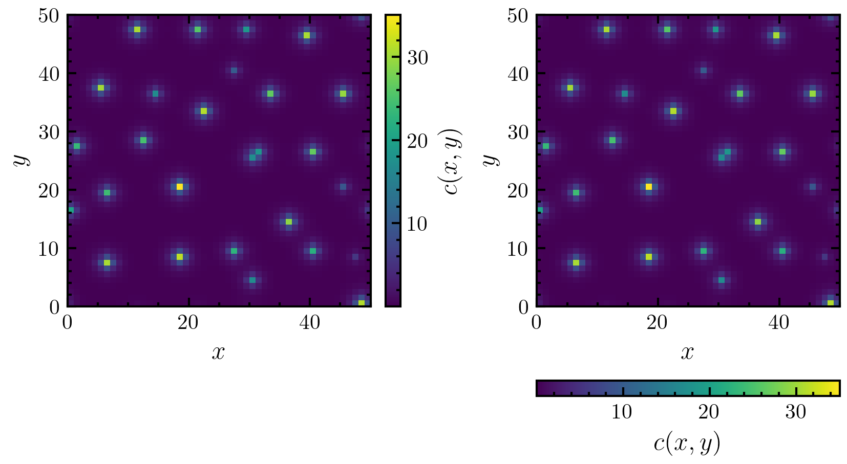 >>> import amep >>> traj = amep.load.traj("../examples/data/continuum.h5amep") >>> frame = traj[-1] >>> X,Y = frame.grid >>> C = frame.data('c') >>> fig, axs = amep.plot.new(figsize=(5.5,3), ncols=2) >>> field1 = amep.plot.field(axs[0], C, X, Y, cmap='viridis') >>> cax1 = amep.plot.add_colorbar( ... fig, axs[0], field1, label=r'$c(x,y)$' ... ) >>> field2 = amep.plot.field(axs[1], C, X, Y, cmap='viridis') >>> cax2 = amep.plot.add_colorbar( ... fig, axs[1], field2, label=r'$c(x,y)$', ... orientation='horizontal' ... ) >>> axs[0].set_xlabel(r'$x$') >>> axs[0].set_ylabel(r'$y$') >>> axs[1].set_xlabel(r'$x$') >>> axs[1].set_ylabel(r'$y$') >>> fig.savefig('./figures/plot/plot-add_colorbar_1.png') >>>