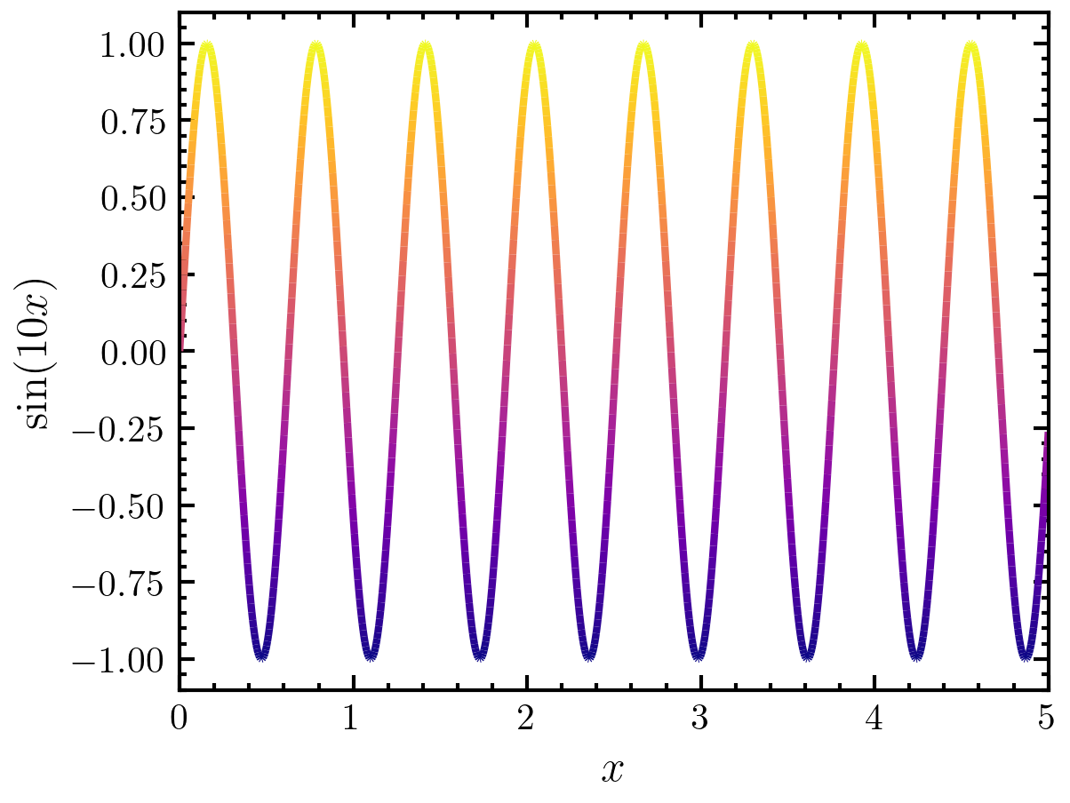 >>> import amep >>> fig, axs = amep.plot.new() >>> x = np.linspace(0,5,1000) >>> y = np.sin(10*x) >>> line = amep.plot.colored_line(axs, x, y) >>> axs.set_xlim(0, 5) >>> axs.set_ylim(-1.1, 1.1) >>> axs.set_xlabel(r'$x$') >>> axs.set_ylabel(r'$\sin(10x)$') >>> fig.savefig('./figures/plot/plot-colored_line.png') >>>