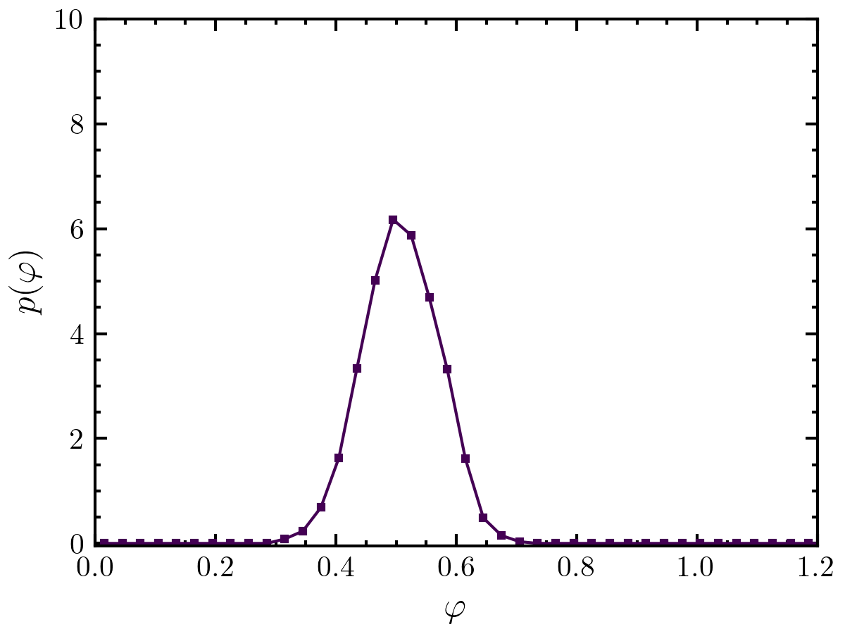 >>> import amep >>> traj = amep.load.traj("../examples/data/lammps.h5amep") >>> ld = amep.evaluate.LDdist( ... traj, nav=traj.nframes, ... mode="packing", use_voronoi=True ... ) >>> fig, axs = amep.plot.new(layout="constrained") >>> def update_frame(data): ... axs.clear() ... plot = axs.plot(data[1], data[0]) ... axs.set_xlabel(r'$\varphi$') ... axs.set_ylabel(r'$p(\varphi)$') ... axs.set_ylim(-0.05, 10) ... axs.set_xlim(0, 1.2) ... return [plot,] >>> amep.plot.create_video( ... fig, update_frame, ld.frames, ... "./figures/plot/plot-create_video.gif", fps=5, ... ) >>>