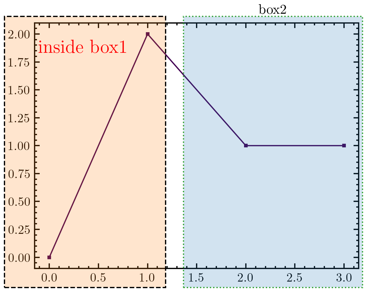 >>> import amep >>> fig, axs=amep.plot.new() >>> axs.plot([0,1,2,3], [0,2,1,1]) >>> amep.plot.draw_box( ... fig, box_extent=[0, 0, 0.45, 1.01], ... text="inside box1", fontsize=15, c="r", ... facecolor="tab:orange", facealpha=0.2, ... dxtext=.12, dytext=-.15, ha="right" ... ) >>> amep.plot.draw_box( ... fig, box_extent=[0.5, 0, 0.5, 1.01], ... text="box2", facecolor="tab:blue", facealpha=0.2, ... edgecolor="tab:green", linestyle=":" ... ) >>> fig.savefig('./figures/plot/plot-draw_box.png') >>>