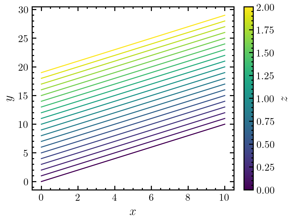 >>> import amep >>> import numpy as np >>> x = np.linspace(0,10,100) >>> z = np.linspace(0,2,20) >>> sm = amep.plot.linear_mappable('viridis', 0, 2) >>> fig, axs = amep.plot.new() >>> for i in range(len(z)): ... axs.plot(x, x+i, c=sm.to_rgba(z[i]), marker='' ... ) >>> cax = amep.plot.add_colorbar(fig, axs, sm, label=r'$z$') >>> axs.set_xlabel(r'$x$') >>> axs.set_ylabel(r'$y$') >>> fig.savefig('./figures/plot/plot-linear_mappable.png') >>>