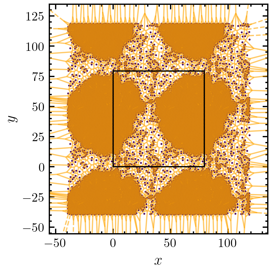 >>> import amep >>> traj = amep.load.traj("../examples/data/lammps.h5amep") >>> frame = traj[-1] >>> vor, idx = amep.order.voronoi( ... frame.coords(), frame.box, pbc=True ... ) >>> fig, axs = amep.plot.new(figsize=(3,3)) >>> amep.plot.voronoi( ... axs, vor, show_vertices=False, line_colors="orange", ... line_width=1, line_alpha=0.6, point_size=1, c="b" ... ) >>> amep.plot.box(axs, frame.box) >>> axs.set_xlabel(r"$x$") >>> axs.set_ylabel(r"$y$") >>> fig.savefig("./figures/plot/plot-voronoi.png") >>>