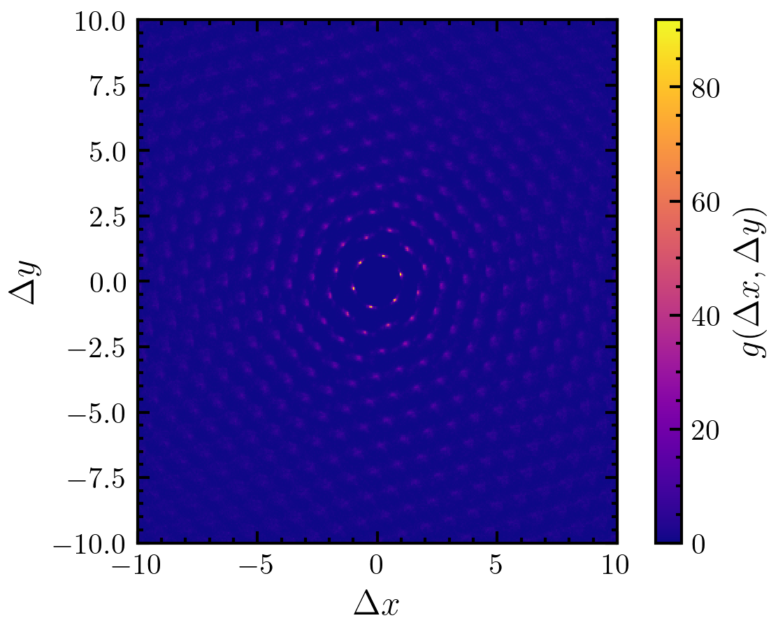 \[g(x,y) = \frac{1}{\rho N}\sum\limits_{i=1}^{N} \sum\limits_{j\neq i}^{N}\delta(x-x_{ij})\delta(y-y_{ij}).\]The cross correlation between different particle species is given by