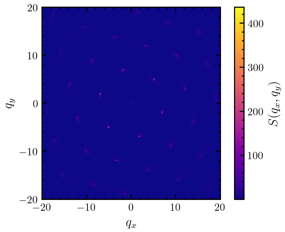 \[\begin{split}S(\vec{q}) = \frac{1}{N} \left\langle\sum_{j=1}^{N}\sum_{k=1}^{N}\exp\left\lbrace-i\vec{q}\cdot(\vec{r}_j-\vec{r}_k)\right\rbrace\right\rangle\\ = \frac{1}{N} \left\langle\sum_{j=1}^{N}\left\lvert\exp\left\lbrace-i\vec{q}\cdot\vec{r}_j\right\rbrace\right\rvert^2\right\rangle,\end{split}\]where \(\rho(\vec{q})\) is the Fourier transform of the particle number density (see Ref. [1] for further information).