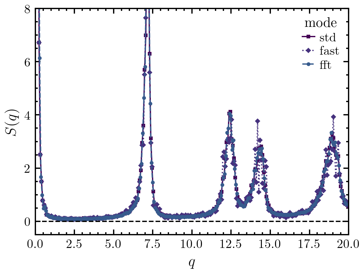 >>> import amep >>> traj = amep.load.traj("../examples/data/lammps.h5amep") >>> frame = traj[-1] >>> S0, q0 = amep.spatialcor.sfiso( ... frame.coords(), frame.box, frame.n(), ... njobs=6, twod=True, chunksize=1000, mode='std' ... ) >>> S1, q1 = amep.spatialcor.sfiso( ... frame.coords(), frame.box, frame.n(), ... njobs=6, twod=True, chunksize=1000, mode='fast' ... ) >>> S2, q2 = amep.spatialcor.sfiso( ... frame.coords(), frame.box, frame.n(), ... njobs=6, twod=True, chunksize=1000, mode='fft', accuracy=0.5 ... ) >>> fig, axs = amep.plot.new() >>> axs.plot(q0, S0, ls='-', label='std') >>> axs.plot(q1, S1, ls=':', label='fast') >>> axs.plot(q2, S2, ls='--', label='fft') >>> axs.set_ylim(-0.5, 8) >>> axs.set_xlim(0, 20) >>> axs.legend(title='mode') >>> axs.set_xlabel(r'$q$') >>> axs.set_ylabel(r'$S(q)$') >>> axs.axhline(0, c='k', ls='--', lw=1) >>> fig.savefig('./figures/spatialcor/spatialcor-sfiso.png') >>>