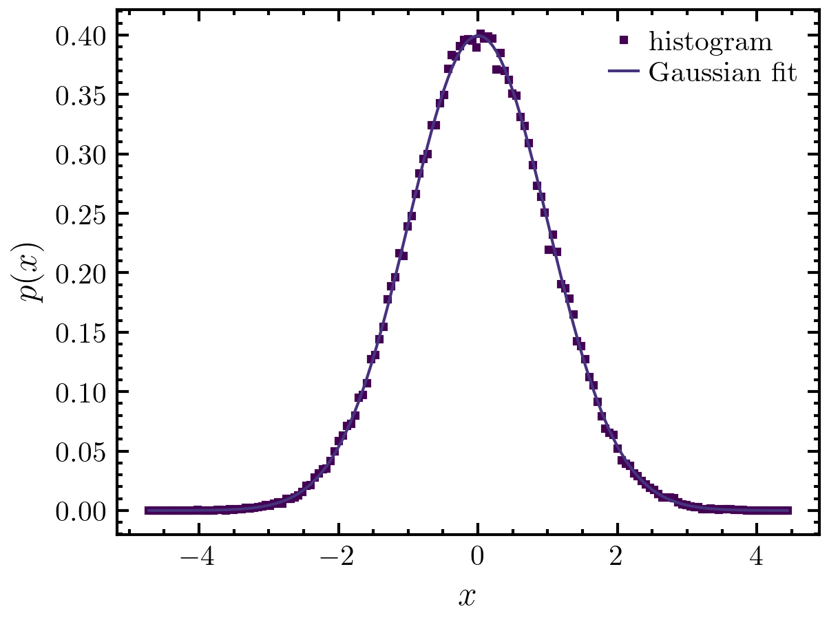 >>> import amep >>> import numpy as np >>> ndata = np.random.normal( ... loc=0.0, scale=1.0, size=100000 ... ) >>> a, abins = amep.statistics.distribution( ... ndata, nbins=None ... ) >>> gfit = amep.functions.NormalizedGaussian() >>> gfit.fit(abins, a) >>> print(gfit.results) {'mu': (0.003195771437101405, 0.002420397928883222), 'sig': (0.9982728437059646, 0.001951630585125867)} >>> fig, axs = amep.plot.new() >>> axs.plot(abins, a, label='histogram', ls='') >>> axs.plot( ... abins, gfit.generate(abins), ... label='Gaussian fit', marker='' ... ) >>> axs.legend() >>> axs.set_xlabel(r'$x$') >>> axs.set_ylabel(r'$p(x)$') >>> fig.savefig('./figures/statistics/statistics-distribution.png') >>>