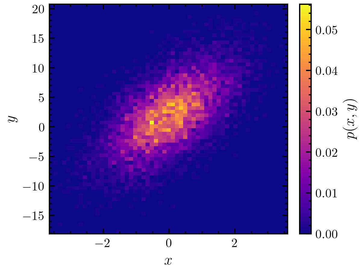 >>> import amep >>> import numpy as np >>> n = 10000 >>> x = np.random.standard_normal(n) >>> y = 2.0 + 3.0 * x + 4.0 * np.random.standard_normal(n) >>> hist, xedges, yedges = amep.statistics.histogram2d(x, y) >>> X,Y = np.meshgrid(xedges, yedges, indexing="ij") >>> fig, axs = amep.plot.new() >>> mp = amep.plot.field(axs, hist, X, Y) >>> cax = amep.plot.add_colorbar(fig, axs, mp, label=r"$p(x,y)$") >>> axs.set_xlabel(r"$x$") >>> axs.set_ylabel(r"$y$") >>> fig.savefig('./figures/statistics/statistics-histogram2d.png') >>>