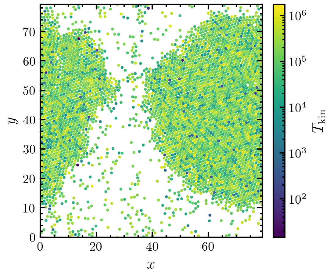 >>> import amep >>> traj = amep.load.traj("../examples/data/lammps.h5amep") >>> frame = traj[-1] >>> tkin = amep.thermo.kintemp( ... frame.velocities(), m=frame.mass() ... ) >>> fig, axs = amep.plot.new(figsize=(3.6,3)) >>> mp = amep.plot.particles( ... axs, frame.coords(), frame.box, frame.radius(), ... values=tkin, cscale="log" ... ) >>> axs.set_xlabel(r'$x$') >>> axs.set_ylabel(r'$y$') >>> cax = amep.plot.add_colorbar( ... fig, axs, mp, label=r"$T_{\rm kin}$" ... ) >>> fig.savefig('./figures/thermo/thermo-kintemp.png') >>>