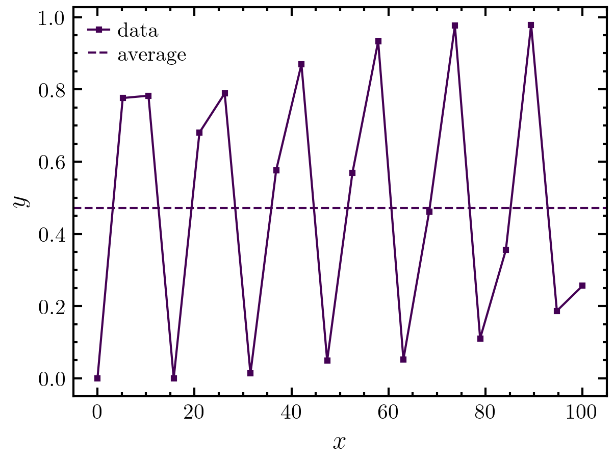>>> import amep >>> import numpy as np >>> def function(x): ... return x**2 >>> x = np.linspace(0,100,1000) >>> y = np.sin(x) >>> function_yvalues, average = amep.utils.average_func( ... function, y, nr=20 ... ) >>> function_xvalues, _ = amep.utils.average_func( ... lambda x:x, x, nr=20 ... ) >>> fig, axs = amep.plot.new() >>> axs.plot( ... function_xvalues, function_yvalues, ... label='data' ... ) >>> axs.axhline(average, label='average', ls='--') >>> axs.legend() >>> axs.set_xlabel(r'$x$') >>> axs.set_ylabel(r'$y$') >>> fig.savefig('./figures/utils/utils-average_func.png') >>>