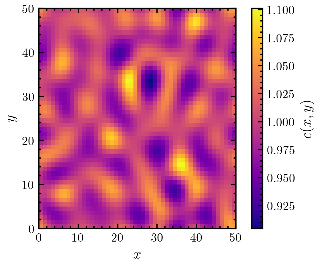 >>> import amep >>> traj = amep.load.traj("../examples/data/continuum.h5amep") >>> frame = traj[3] >>> C = frame.data('c') >>> X, Y = frame.grid >>> sq2d, qx, qy = amep.continuum.sf2d(C, X, Y) >>> fig, axs = amep.plot.new(figsize=(3.6,3)) >>> mp = amep.plot.field(axs, C, X, Y) >>> cax = amep.plot.add_colorbar( ... fig, axs, mp, label=r'$c(x,y)$' ... ) >>> axs.set_xlabel(r'$x$') >>> axs.set_ylabel(r'$y$') >>> fig.savefig('./figures/utils/utils-domain_length_1.png') >>>