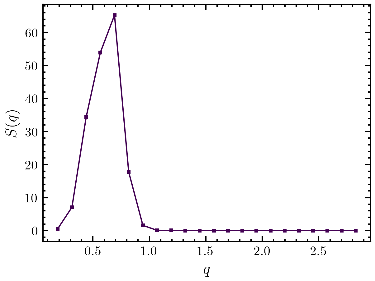>>> sq, q = amep.utils.sq_from_sf2d(sq2d, qx, qy) >>> fig, axs = amep.plot.new() >>> axs.plot(q[1:], sq[1:]) >>> axs.set_xlabel(r'$q$') >>> axs.set_ylabel(r'$S(q)$') >>> fig.savefig('./figures/utils/utils-domain_length_2.png') >>>
