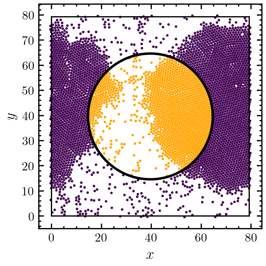 >>> import amep >>> traj = amep.load.traj("../examples/data/lammps.h5amep") >>> frame = traj[-1] >>> center = frame.box.mean(axis=1) >>> R = 25 >>> inside, idxin = amep.utils.in_circle( ... frame.coords(), R, indices=True, center=center ... ) >>> outside, idxout = amep.utils.in_circle( ... frame.coords(), R, reverse=True, ... indices=True, center=center ... ) >>> fig, axs = amep.plot.new(figsize=(3,3)) >>> amep.plot.particles( ... axs, inside, frame.box, frame.radius()[idxin], ... set_ax_limits = False, color='orange' ... ) >>> amep.plot.particles( ... axs, outside, frame.box, frame.radius()[idxout], ... set_ax_limits = False ... ) >>> amep.plot.box(axs, frame.box) >>> angle = np.linspace(0, 2*np.pi, 150) >>> x = R*np.cos(angle) + center[0] >>> y = R*np.sin(angle) + center[1] >>> axs.plot(x, y, c='k', lw=2, marker='') >>> axs.set_xlabel(r'$x$') >>> axs.set_ylabel(r'$y$') >>> fig.savefig('./figures/utils/utils-in_circle.png') >>>