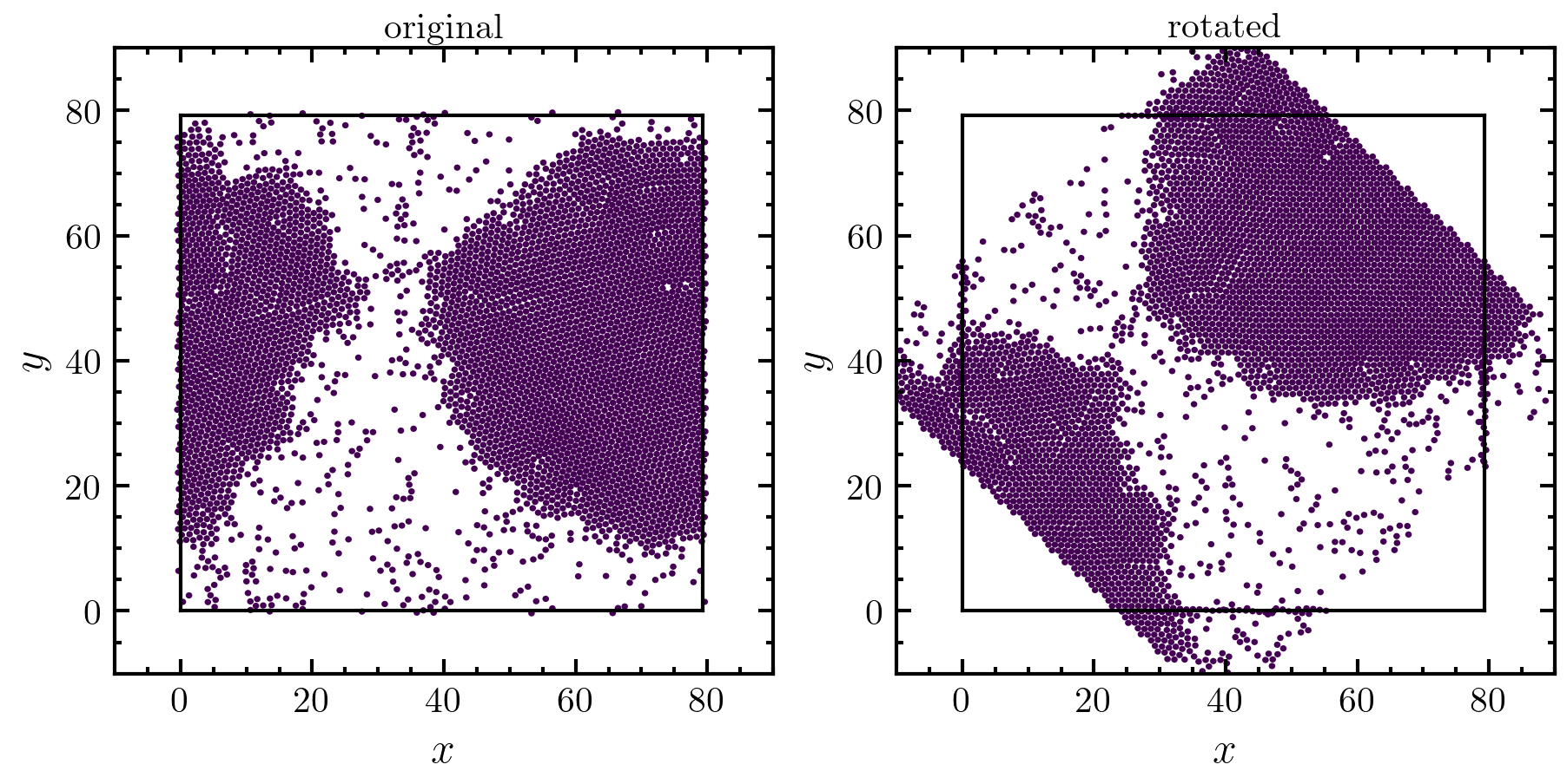 >>> import amep >>> traj = amep.load.traj("../examples/data/lammps.h5amep") >>> frame = traj[-1] >>> theta = 0.25*np.pi >>> rcoords = amep.utils.rotate_coords( ... frame.coords(), theta, np.mean(frame.box, axis=1) ... ) >>> fig, axs = amep.plot.new(ncols=2, figsize=(6,3)) >>> amep.plot.particles( ... axs[0], frame.coords(), frame.box, frame.radius(), ... set_ax_limits=False ... ) >>> amep.plot.box(axs[0], frame.box) >>> axs[0].set_xlim(-10, 90) >>> axs[0].set_ylim(-10, 90) >>> axs[0].set_xlabel(r'$x$') >>> axs[0].set_ylabel(r'$y$') >>> axs[0].set_title('original') >>> amep.plot.particles( ... axs[1], rcoords, frame.box, frame.radius(), ... set_ax_limits=False ... ) >>> amep.plot.box(axs[1], frame.box) >>> axs[1].set_xlim(-10, 90) >>> axs[1].set_ylim(-10, 90) >>> axs[1].set_xlabel(r'$x$') >>> axs[1].set_ylabel(r'$y$') >>> axs[1].set_title('rotated') >>> fig.savefig('./figures/utils/utils-rotate_coords.png') >>>