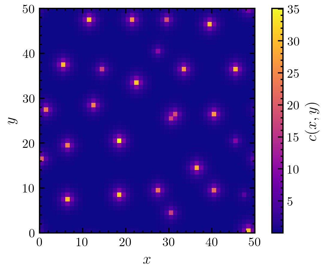 >>> import amep >>> traj = amep.load.traj("../examples/data/continuum.h5amep") >>> frame = traj[-1] >>> X, Y = frame.grid >>> C = frame.data('c') >>> X_COARSE = amep.utils.segmented_mean2d(X, 6) >>> Y_COARSE = amep.utils.segmented_mean2d(Y, 6) >>> C_COARSE = amep.utils.segmented_mean2d(C, 6) >>> fig, axs = amep.plot.new(figsize=(3.6,3)) >>> mp = amep.plot.field(axs, C, X, Y) >>> cax = amep.plot.add_colorbar( ... fig, axs, mp, label=r'$c(x,y)$' ... ) >>> axs.set_xlabel(r'$x$') >>> axs.set_ylabel(r'$y$') >>> fig.savefig('./figures/utils/utils-segmented_mean2d.png') >>>