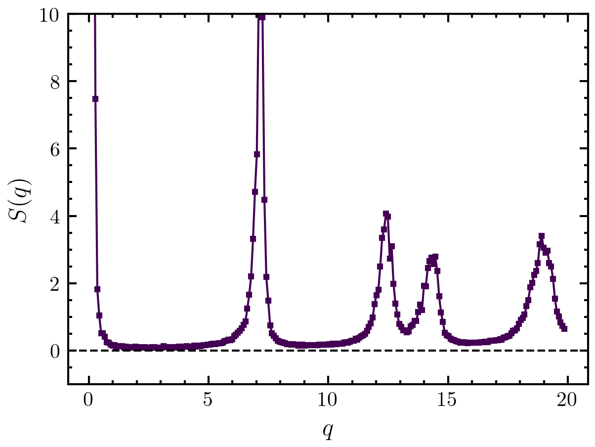 >>> import amep >>> traj = amep.load.traj("../examples/data/lammps.h5amep") >>> frame = traj[-1] >>> S, Kx, Ky = amep.spatialcor.sf2d(frame.coords(), frame.box) >>> Sq, q = amep.utils.sq_from_sf2d(S, Kx, Ky) >>> fig, axs = amep.plot.new() >>> axs.plot(q, Sq) >>> axs.axhline(0.0, ls='--', c='k') >>> axs.set_xlabel(r'$q$') >>> axs.set_ylabel(r'$S(q)$') >>> axs.set_ylim(-1, 10) >>> fig.savefig('./figures/utils/utils-sq_from_sf2d.png') >>>