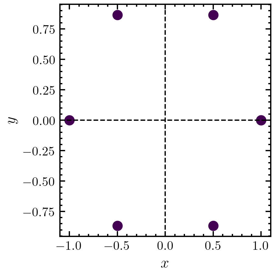 >>> import amep >>> import numpy as np >>> print(amep.utils.unit_vector_2D(60)) [0.5 0.8660254 0. ] >>> theta = np.array([0, 60, 120, 180, 240, 300, 360]) >>> vectors = amep.utils.unit_vector_2D(theta) >>> fig, axs = amep.plot.new(figsize=(3,3)) >>> axs.scatter(vectors[:,0], vectors[:,1], s=50) >>> axs.set_xlabel(r'$x$') >>> axs.set_ylabel(r'$y$') >>> axs.axhline(0, c='k', lw=1, ls='--') >>> axs.axvline(0, c='k', lw=1, ls='--') >>> fig.savefig('./figures/utils/utils-unit_vector_2D.png') >>>