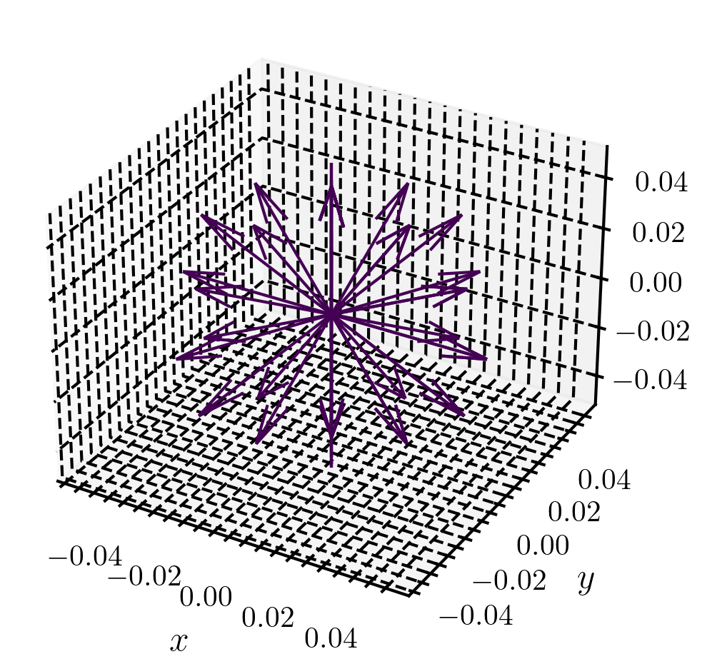 >>> import amep >>> import numpy as np >>> import matplotlib.pyplot as plt >>> print(amep.utils.unit_vector_3D(60, 60)) >>> theta = np.array([0, 30, 60, 90, 120, 150, 180]) >>> phi = np.array([0, 60, 120, 180, 240, 300, 360]) >>> t, p = np.meshgrid(theta, phi) >>> vectors = amep.utils.unit_vector_3D( ... t.flatten(), p.flatten() ... ) >>> fig = plt.figure() >>> axs = fig.add_subplot(111, projection='3d') >>> axs.quiver( ... 0, 0, 0, vectors[:,0], vectors[:,1], ... vectors[:,2], length=0.05 ... ) >>> axs.set_xlabel(r'$x$') >>> axs.set_ylabel(r'$y$') >>> axs.set_zlabel(r'$z$') >>> fig.savefig('./figures/utils/utils-unit_vector_3D.png') >>>