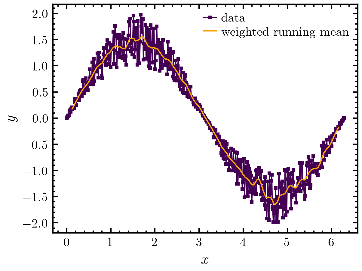 >>> import amep >>> import numpy as np >>> x = np.linspace(0,2*np.pi,500) >>> y = np.sin(x)*(1+np.random.rand(len(x))) >>> yav = amep.utils.weighted_runningmean( ... y, kernel='triangle', nav=20 ... ) >>> xav = amep.utils.weighted_runningmean( ... x, kernel='homogenous', nav=20 ... ) >>> fig, axs = amep.plot.new() >>> axs.plot(x, y, label='data') >>> axs.plot( ... xav, yav, label='weighted running mean', ... marker='', c='orange' ... ) >>> axs.legend() >>> axs.set_xlabel(r'$x$') >>> axs.set_ylabel(r'$y$') >>> fig.savefig('./figures/utils/utils-weighted_runningmean.png') >>>