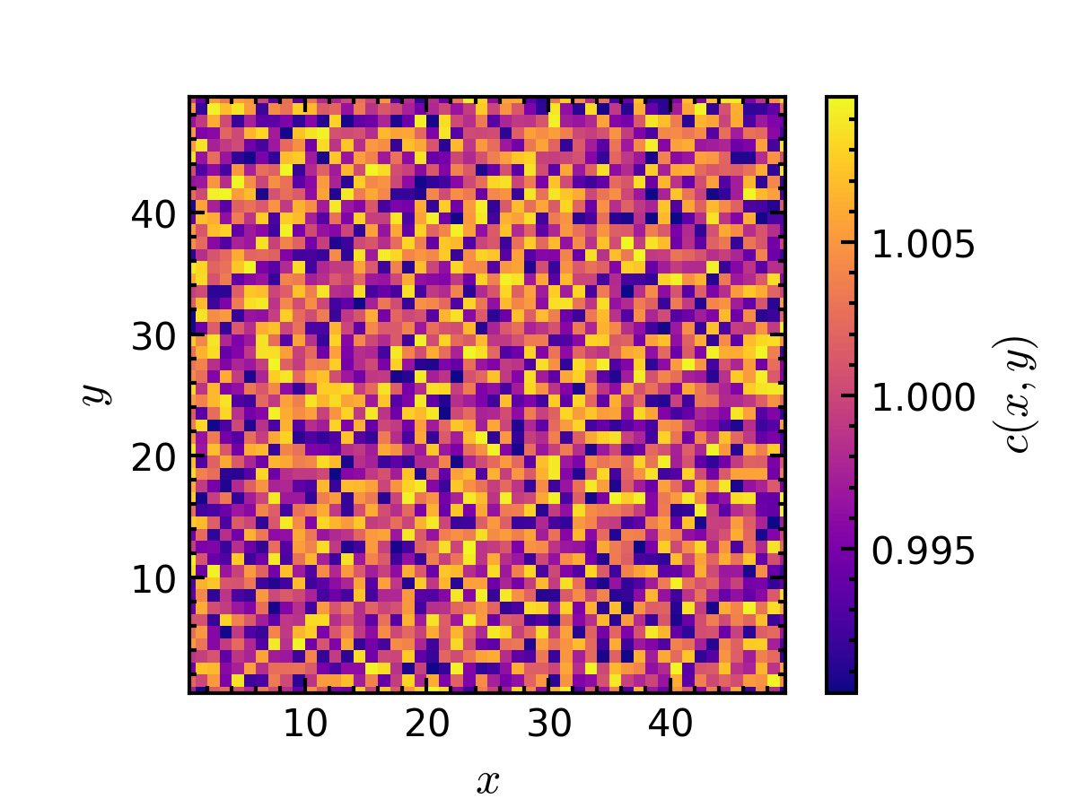 ctraj.animate('./field-animation.gif', ftype='c', xlabel=r'$x$', ylabel=r'$y$', cbar_label=r'$c(x,y)$')
